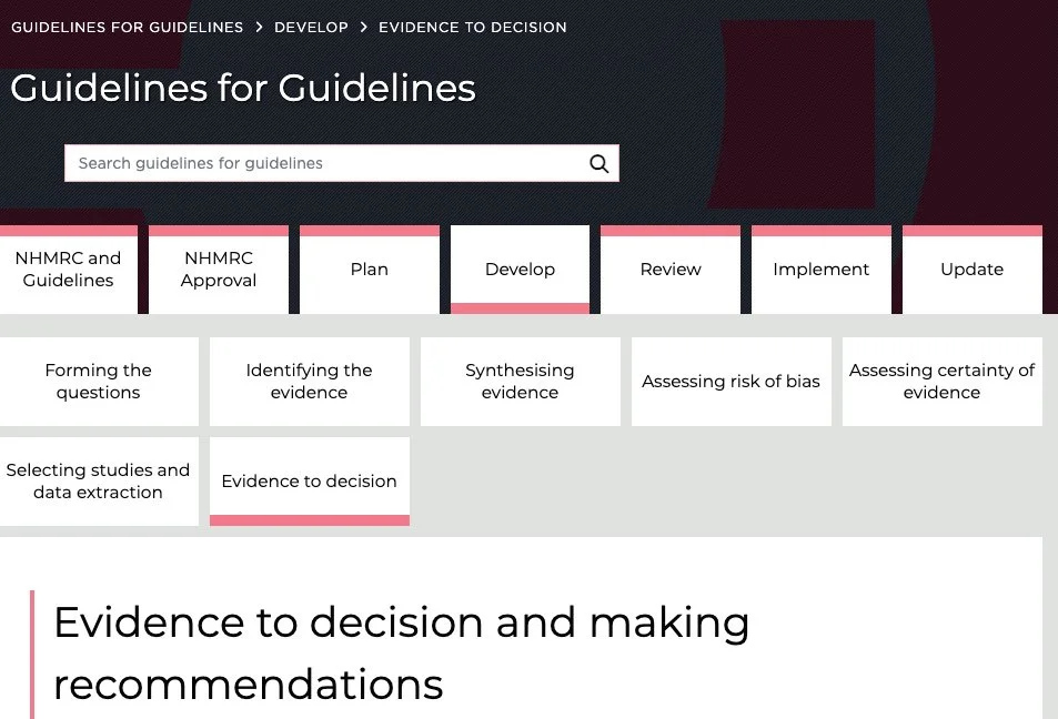 Our work aims to ensure guideline developers have access to guidance and support needed to meet the requirements for developing their guideline to NHMRC standards.
