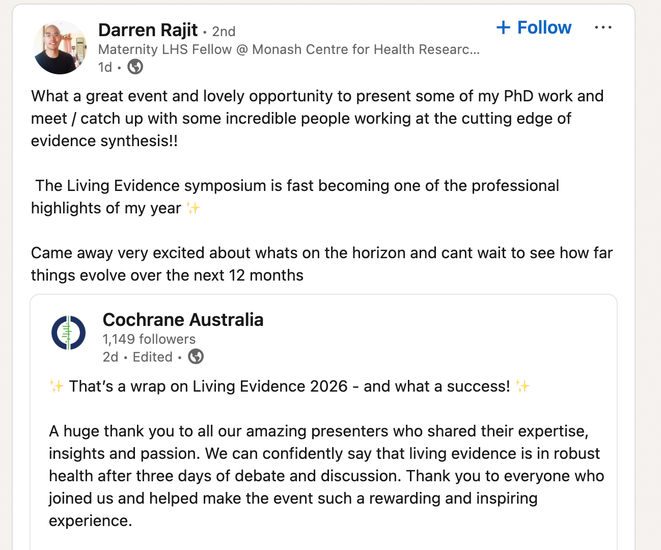 Thanks also to Cochrane Australia Co-Director Steve McDonald for his characteristic energy and enthusiasm for bringing together another stellar line up of speakers and topics for Symposium 2026.